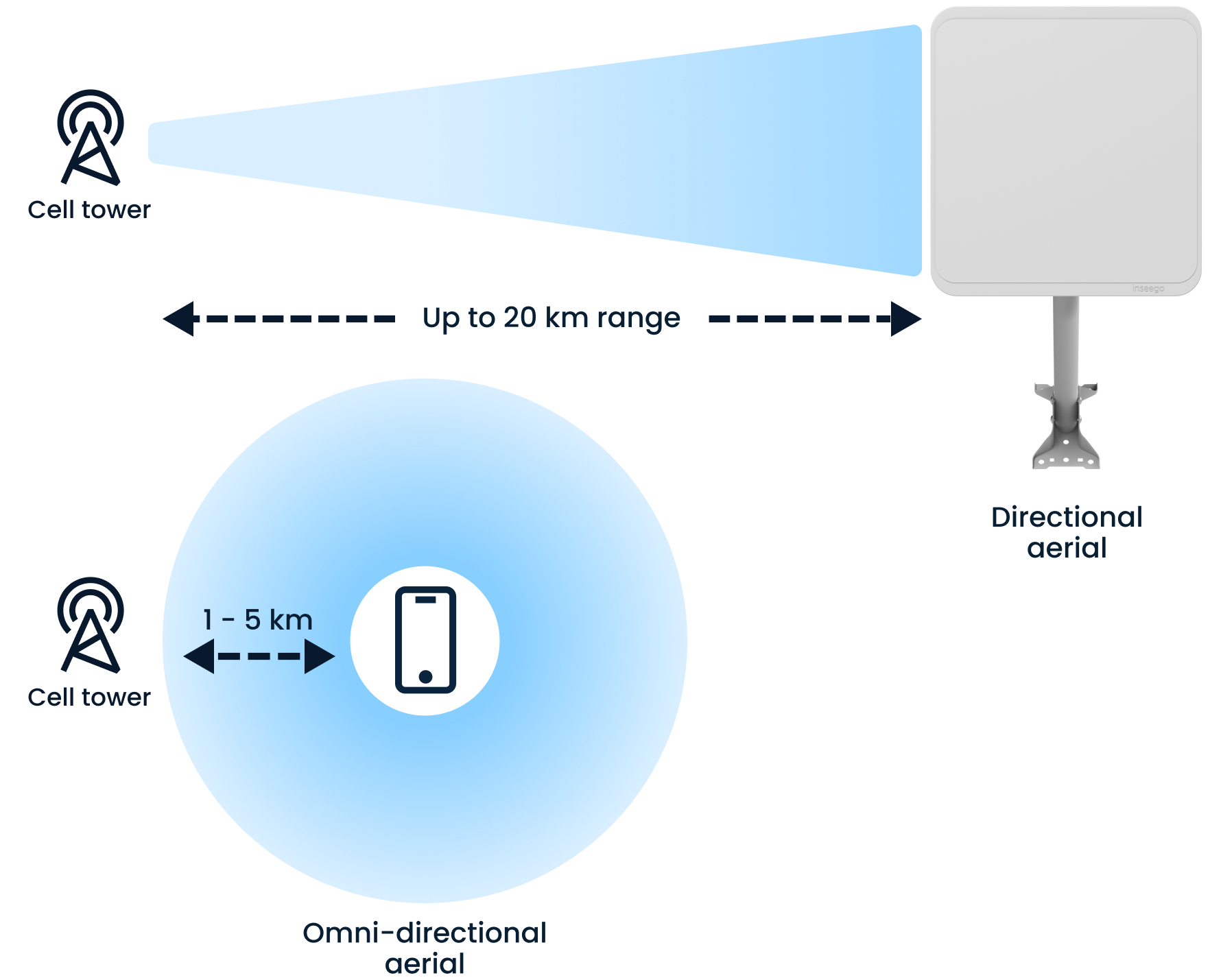Mobile phones use compact omni-directional antenna with limited range. Our fixed outdoor antennas features both powerful directional and omni-directional aerials, capturing strong signal from up to 20 kilometres away when properly aligned.