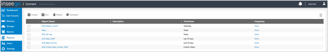Use the Reports page to create and run reports for data usage, signal quality, alarm history, and inventory.
