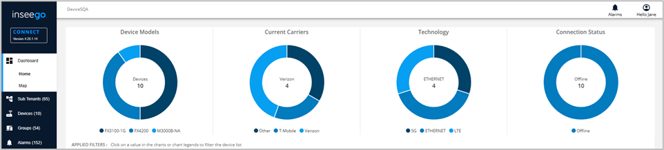 The charts at the top of the page provide visual displays of information about devices registered with Inseego Connect.