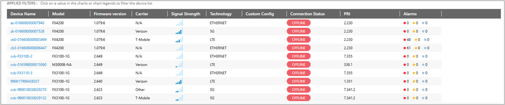 - To filter the information in this table, click on colors in the graphs above. For example, to see a list of MiFi M3000 devices on 5G, select the color for MiFi M3000 in the Device Models graph and the color for 5G in the Technology graph. Select Clear all filters to clear filters and show all devices.