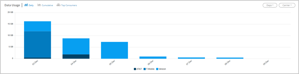 Daily — Displays data usage for all connected devices per day. Use the dropdowns in the upper right to change the number of days displayed or to filter on a specific carrier.