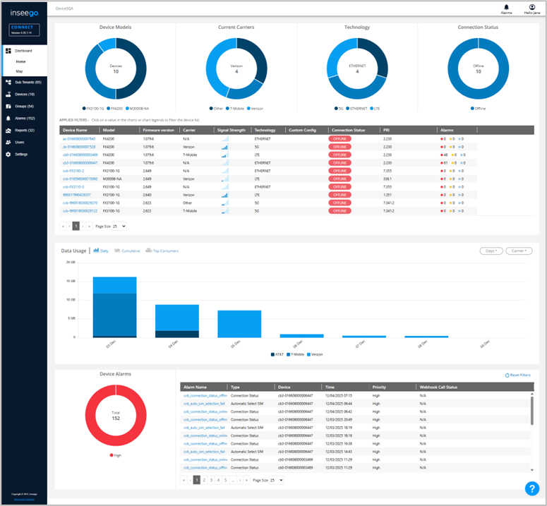 The Dashboard Home page displays charts for device models, current carriers, technology, and connection status. It also provides details on devices, a data usage graph, and alarm information.