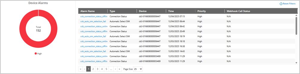 - Click on a color in the Device Alarms chart to filter the list for that priority. If you click on additional color, filtering also includes that priority. Select Reset Filters in the upper right to clear your selections and show all alarms.