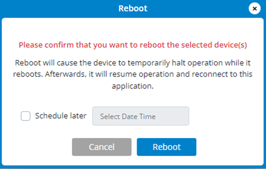 1. Check the box next to the device(s) and click the Reboot button. A confirmation dialog appears: