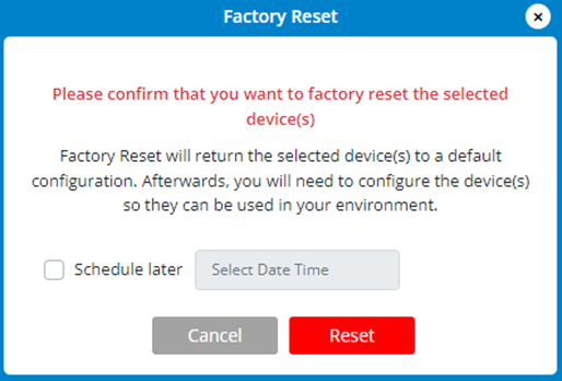 2. Click Reset or use Schedule later to schedule the factory reset for a later time and then click Reset.
