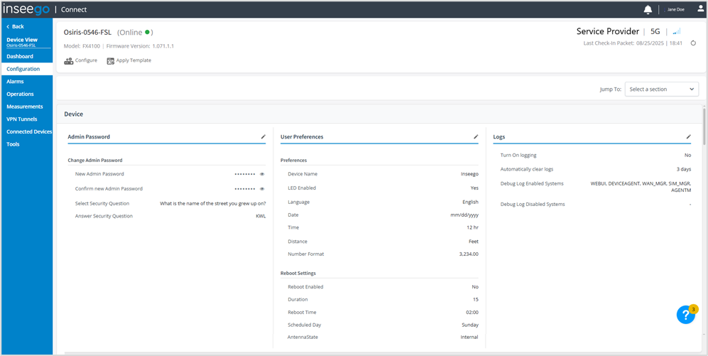 The Configuration page displays all the current configuration settings for the device on one page.