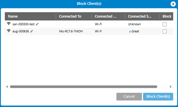 2. Click Block Client to confirm. The device is removed from the Clients group and appears in the Blocked Clients group.