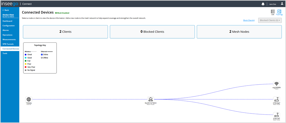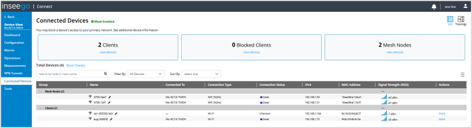 This page provides details about each client device and mesh node connected to the selected Inseego device. You can block or unblock client devices from internet access.