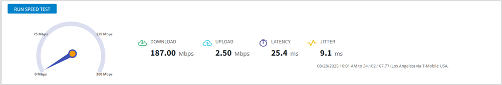The speed test provides you with performance insight on the device’s current WAN/cellular connection; including: download speed, upload speed, latency, and jitter. You can use this tool to help find the best location for the device.