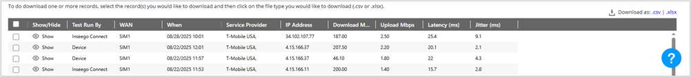 Test Run By: Indicates whether the speed test was initiated from the device web UI or from Inseego Connect.
