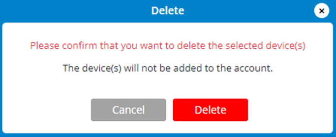 1. Check the box next to the device(s) you wish to delete and click the Delete button. A confirmation dialog appears: