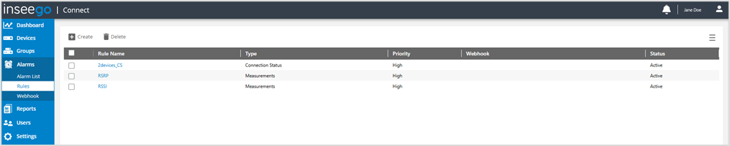 Use the Rules page to create and manage alarm rules.