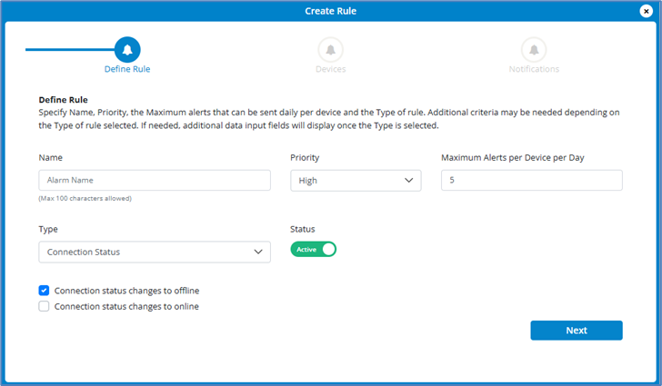 5. Select the Type of alarmfrom the dropdown (Connection Status, Device Data Usage, Carrier Data Usage, SIM Data Usage, WAN Data Usage, Measurements, Geofence, VPN Tunnel Status, Cellular Failover, WAN Failover).