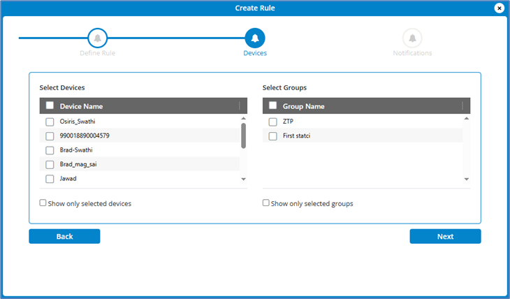 9. Use the checkboxes in the Select Devices list to select devices for the alarm rule or use the checkbox at the top to select all devices in the list. After making your selections, you can check the Show only selected devices box, if desired.