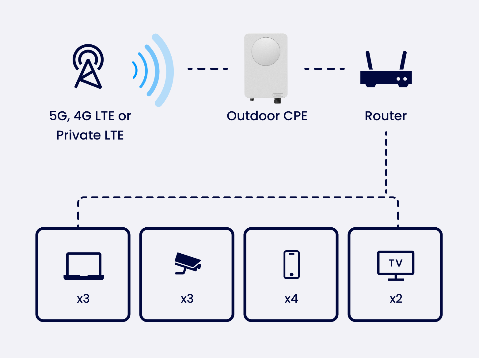 Outdoor CPEs use cellular data (4G LTE and/or 5G) to provide high-speed broadband to a base router that is then distributed to a secure network.