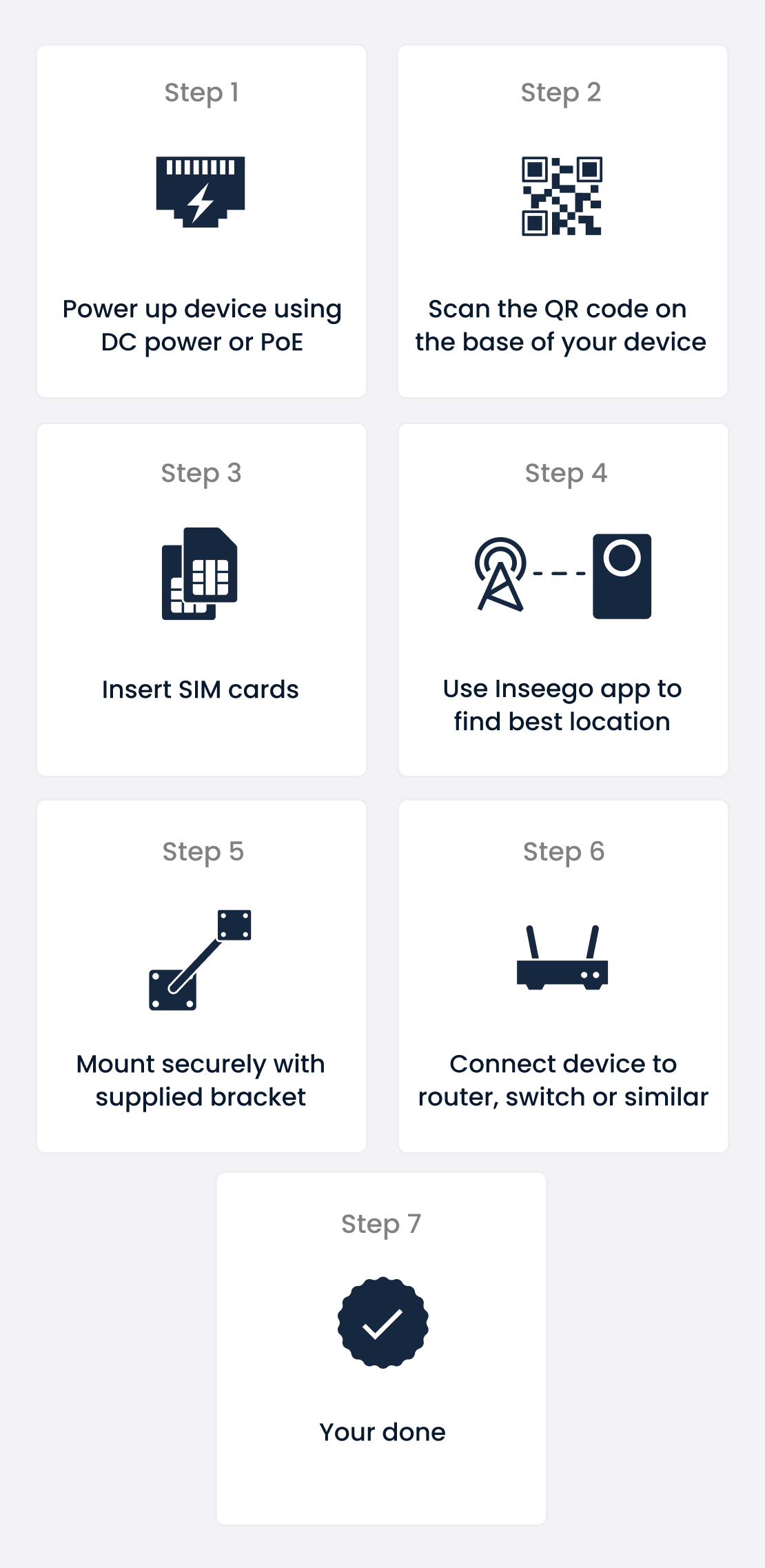 The Inseego mobile app for installation and device management provides intuitive step-by-step setup instructions and includes a site survey to determine the optimal location and orientation to mount your device.