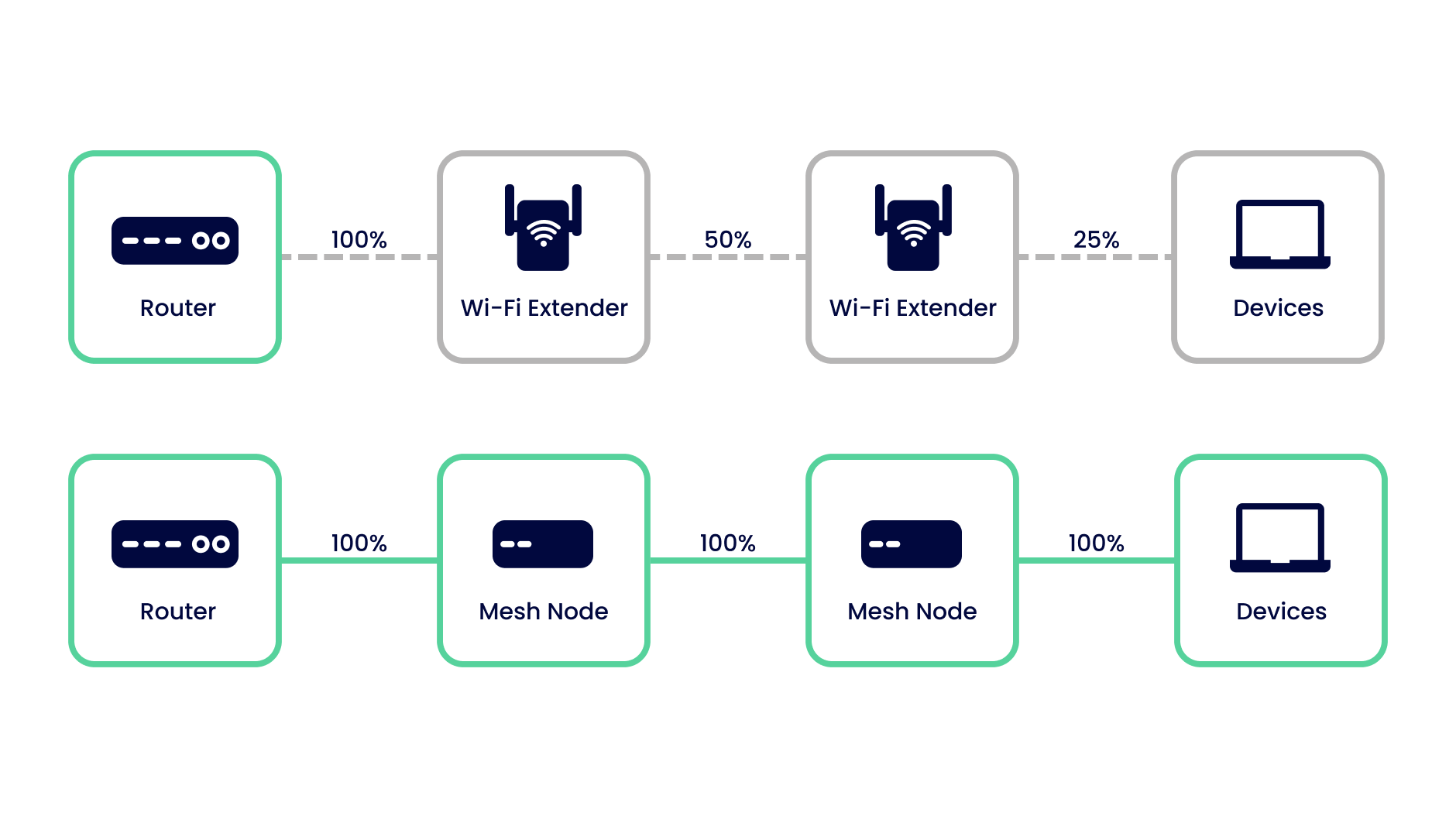 Wi-Fi extenders, also known as Wi-Fi range extenders or Wi-Fi repeaters, expand the reach of an existing Wi-Fi network by rebroadcasting the signal from the main router, making them heavily reliant on the initial signal strength being of high quality. Their half-duplex operation with the existing router often means they cannot simultaneously send and receive data, halving their available bandwidth. And users must manually switch their devices to the extender's network when they move out of the router's range, which can disrupt connectivity.